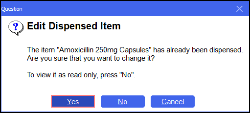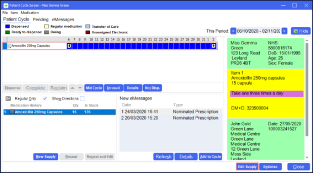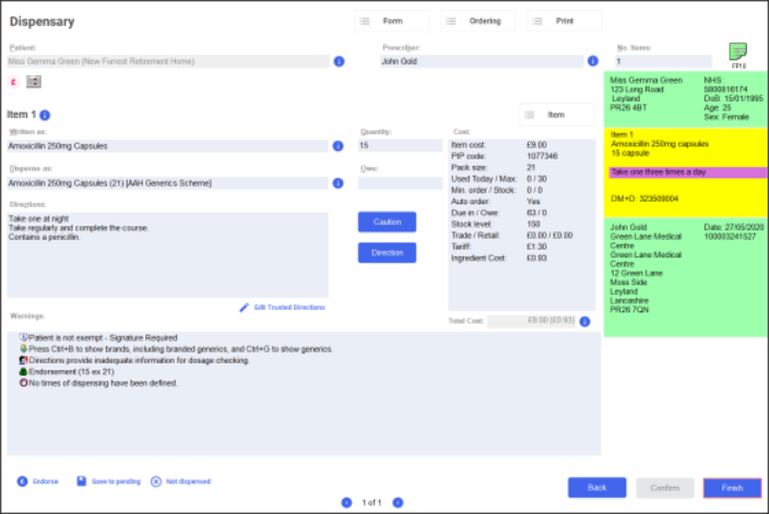 The Dispensary screen displays populated with the prescription details. Update the details as required:
