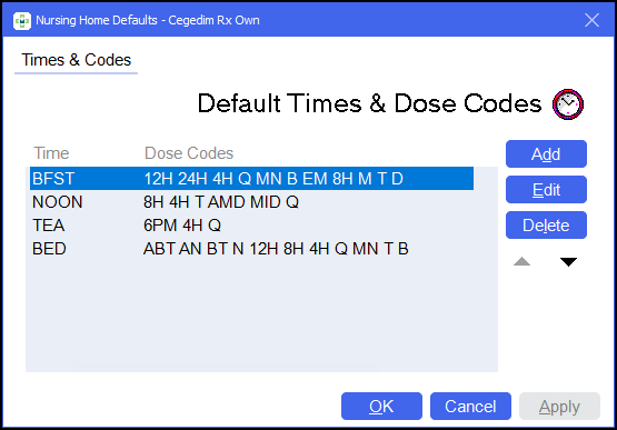 To amend global administration times that are used across the system, from the Default Times & Dose Codes screen: