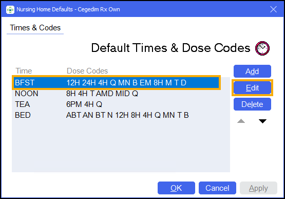 To amend global dose codes that are used across the system, from the Default Times & Dose Codes screen:
