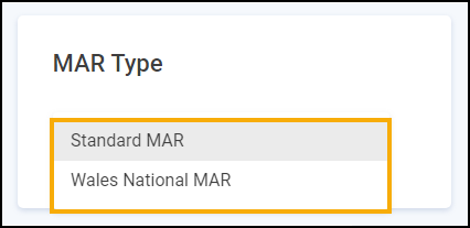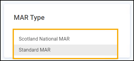 MAR Type (Scotland only) - Select the Medication Administration Record (MAR) chart required: