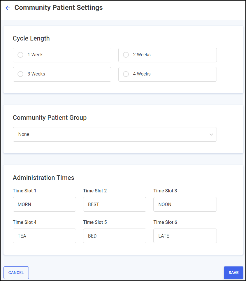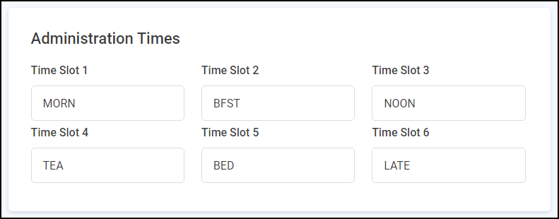 Administration Times - Set the administration times for the patient. The following time slots are set as default:
