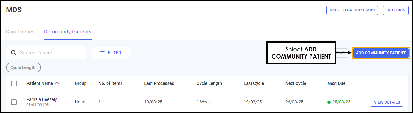ADD COMMUNITY PATIENT - Select to add a community patient, see Adding a Community Patient for details.