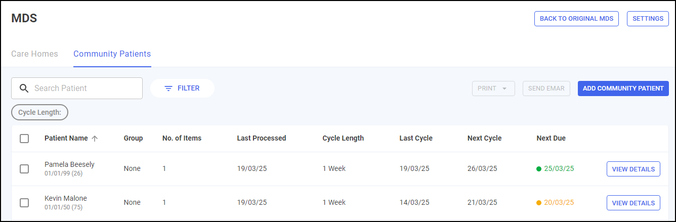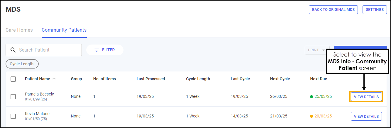 VIEW DETAILS - Select to view an individual patient's cycle details, see Monitored Dosage System (MDS) Info - Community Patient for details.