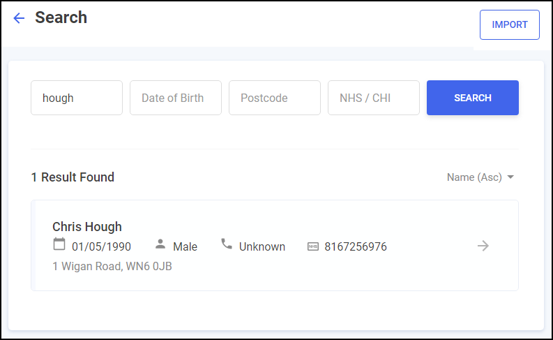 The Search screen displays. Search for a patient by Patient Name, Date of Birth, Postcode or NHS/CHI number. Select SEARCH
