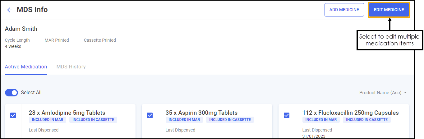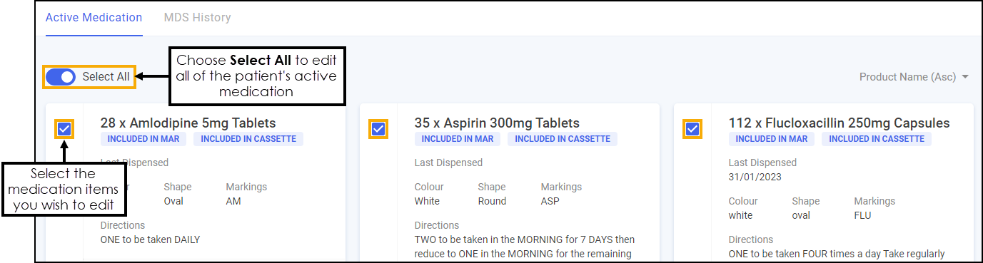 From the Active Medication tab, either select the medication items you wish to edit, or choose Select All to edit all of the patient's active medications: