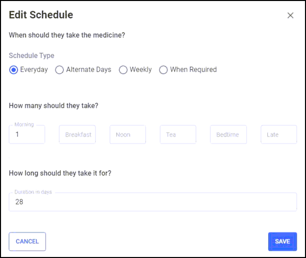 How many should they take? - Enter how many the patient should take in the time of day required, for example, one in the morning.