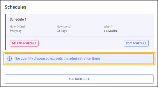A warning displays if there is a mismatch with quantity dispensed and administration times, either: