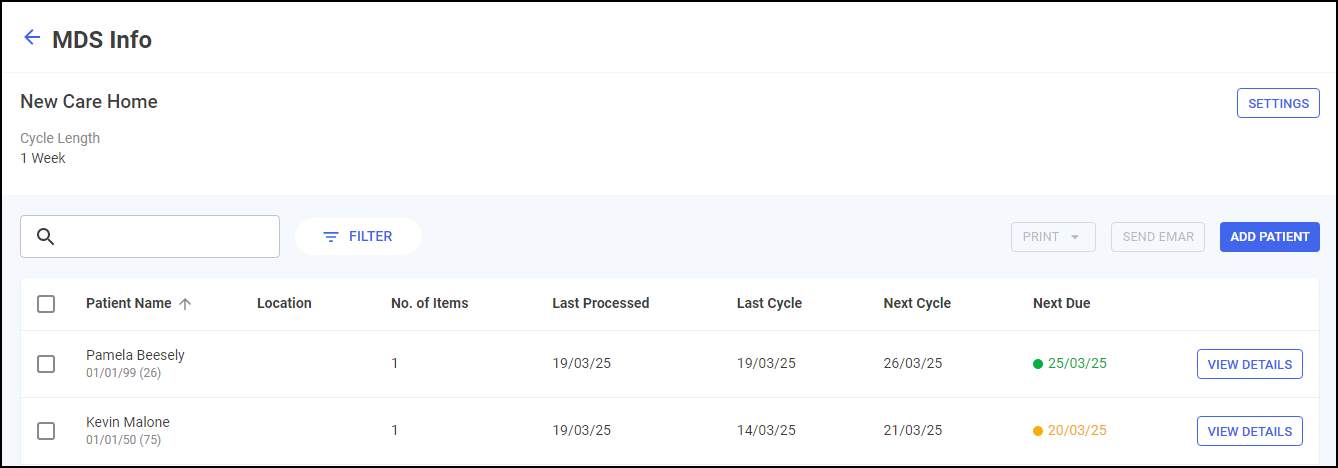 VIEW DETAILS - Select to view an individual patient's cycle details, see Monitored Dosage System (MDS) Info - Care Home Patient for details.