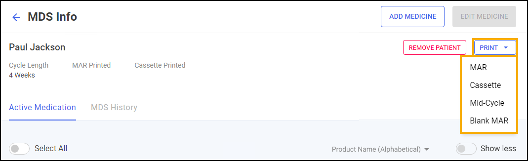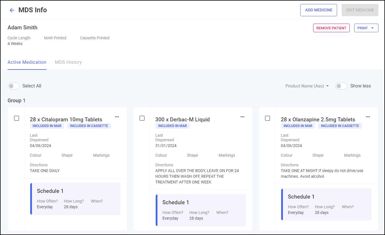From here you can view the patient's cycle length, whether the Medication Administration Record (MAR) chart or Cassette sheet is printed, their active medication and the patient's MDS history. The screen is split into two tabs, Active Medication and MDS History: