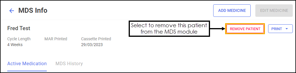From the MDS Info - Patient screen, to remove a care home patient from the MDS module, simply select REMOVE PATIENT