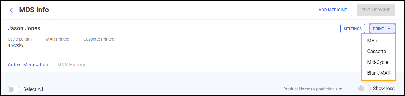 You can print a MAR chart or cassette sheet for the patient from the MDS Info screen, simply select Print and then select from the available options: