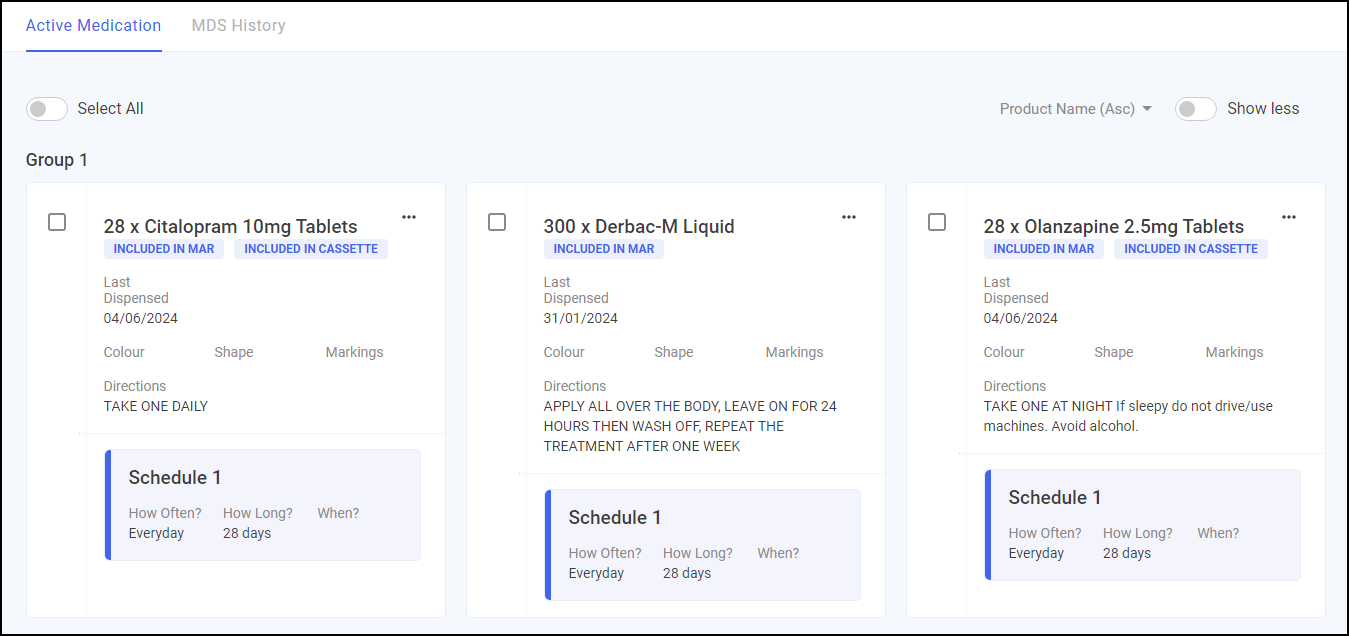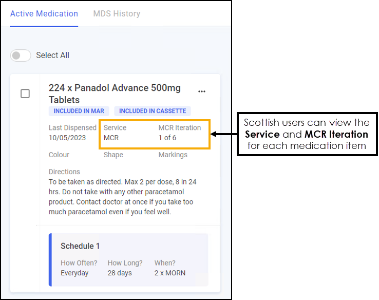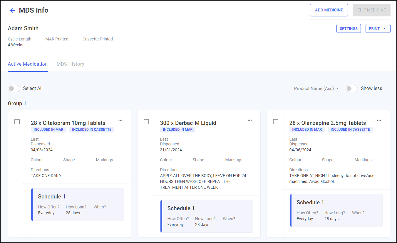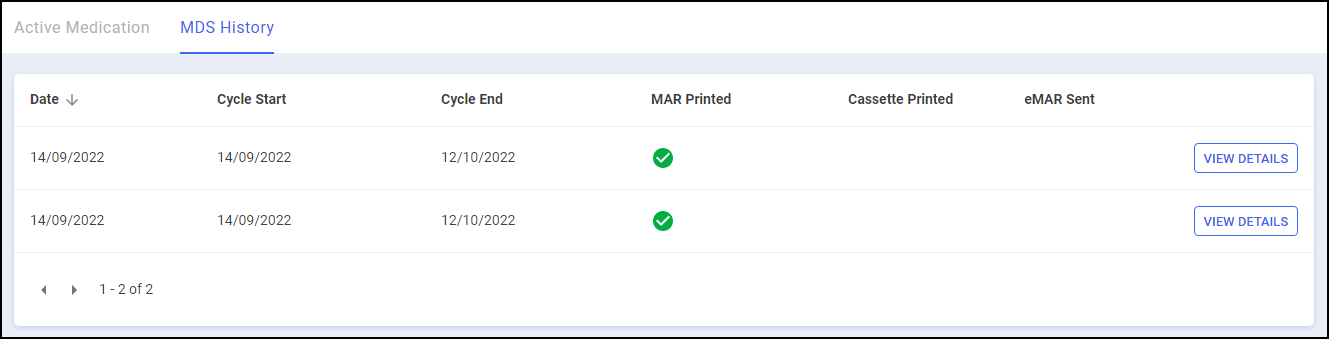 From here you can view the patient's cycle length, whether the Medication Administration Record (MAR) chart or Cassette sheet is printed, their active medication and the patient's MDS history. The screen is split into two tabs, Active Medication and MDS History: