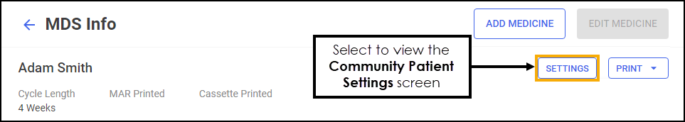 to view and edit the MDS settings, such as Cycle Length or Community Patient Group, for the community patient selected: