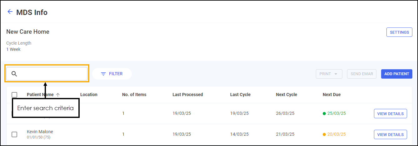 From the MDS Info - Care Home screen, in the search box enter the search criteria, the list below updates as you type: