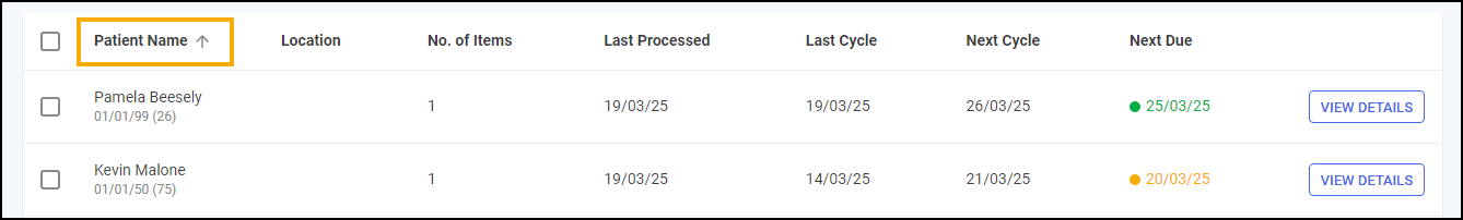 Patients display alphabetically by default. To manually sort the patients, simply select the column header to sort Oldest to Newest / A-Z
