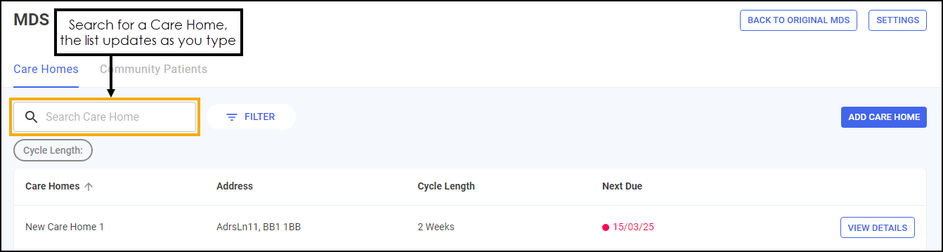 From the Care Homes tab, in Search Care Home enter the search criteria, the list below updates as you type: