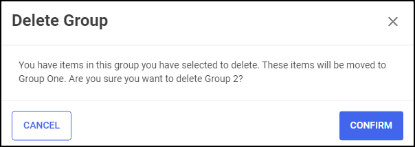 Please note, if the group contains items, you are prompted 'You have items in this group you have selected to delete. These items will be moved to Group One. Are you sure you want to delete Group n', where n is the group number you are deleting. Select CONFIRM