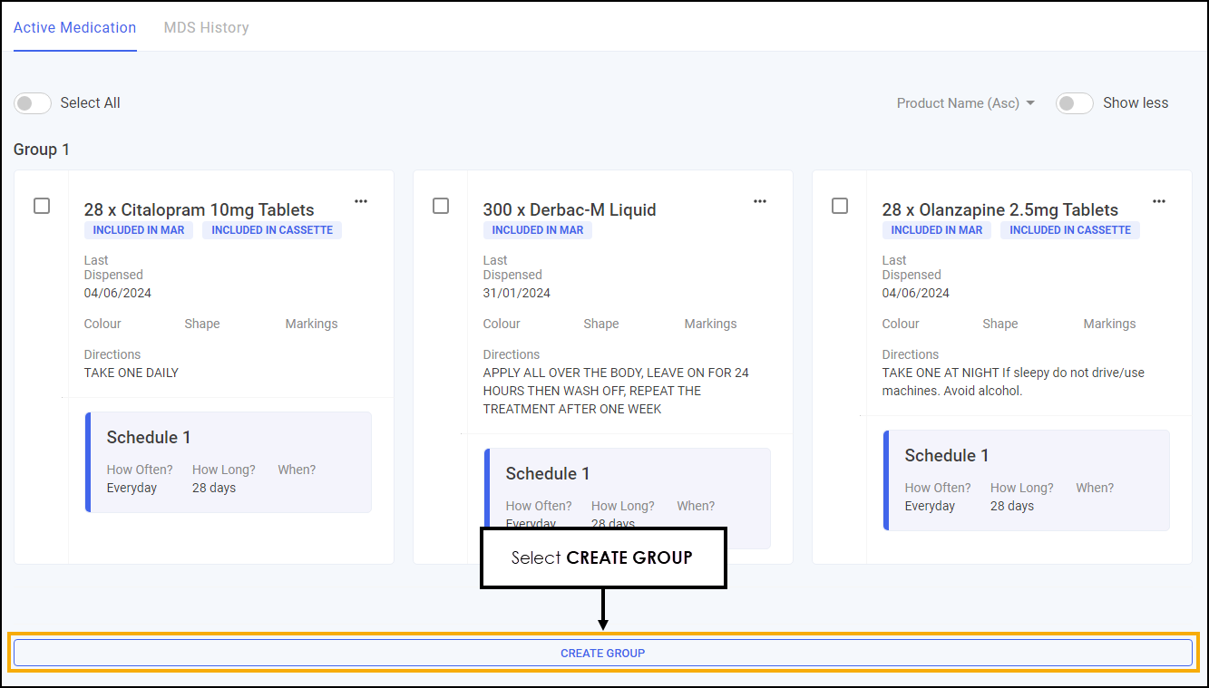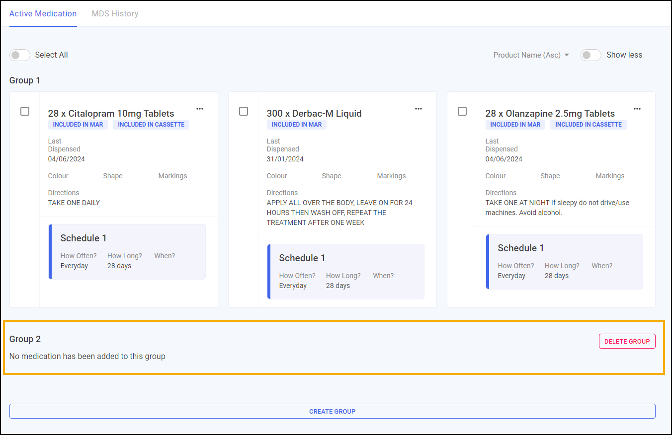 The medication can be split into multiple groups on the Active Medication screen, this acts as a page break when printing a MAR chart. This can be used to separate medication types, for example, tablets, creams and dressings.