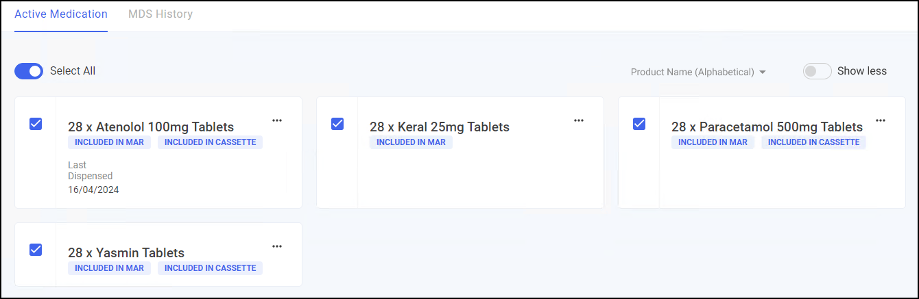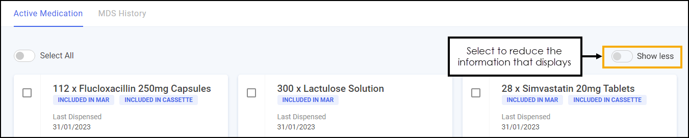 Select Show Less to reduce the information that displays for each medication item: