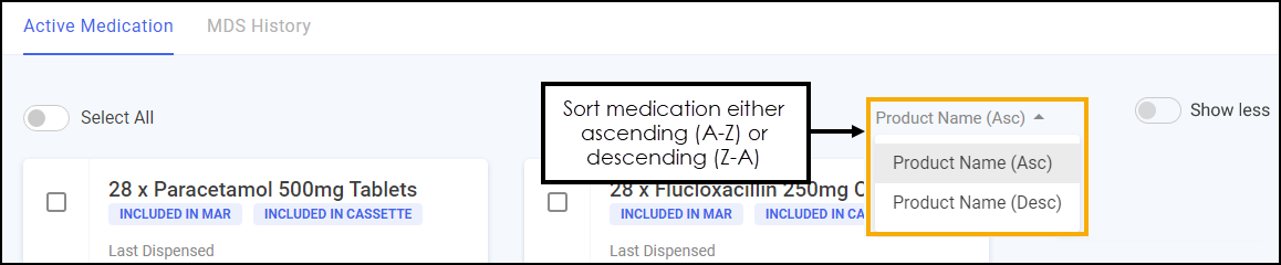 To sort the active medication alphabetically, select Product Name (Asc) for ascending (A-Z) or Product Name (Desc) for descending (Z-A):