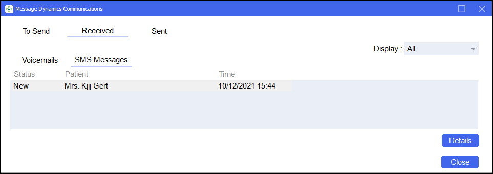 From Message Dynamics Communication, select Received and select SMS Messages. All received SMS messages display: