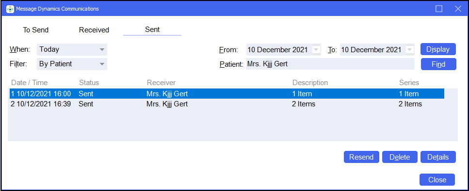 The Sent tab displays all messages that have been sent by Message Dynamics: