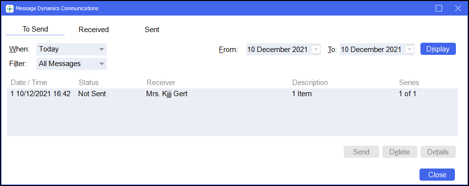 The To Send tab displays all messages that are ready to be sent by Message Dynamics: