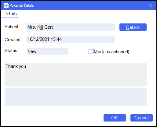 The Voicemail Details screen displays where you can record the content of the message, so that it can be reviewed at a later date if necessary: