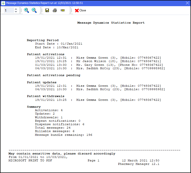 The Message Dynamics Statistics Report displays: