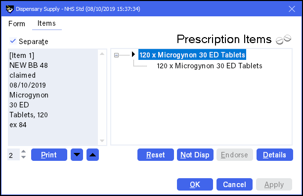 - Once a prescription is complete, providing you have set the Endorsement printing option to Always in User Details, the Dispensary Supply screen displays: