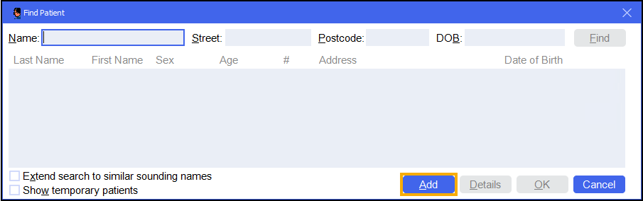 To include temporary patients on the Find Patient screen, simply place a tick next to Show temporary patients: