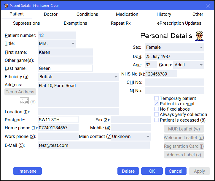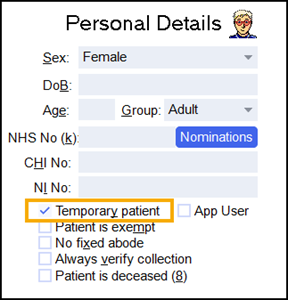 To add a temporary patient, place a tick next to Temporary patient on the Patient Details - Patient screen: