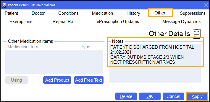 From the Dispensary screen, press F6 on your keyboard, the Patient Details screen displays on the Other tab.