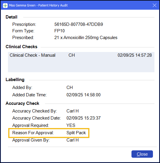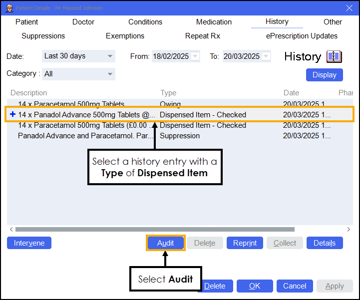 To access the Patient History Audit screen, from the Patient Details - History screen, highlight a dispensed item and select Audit
