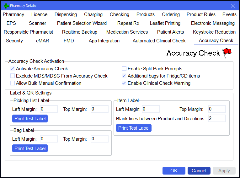 From the Pharmacy Manager Toolbar, select Tools - System Settings - Pharmacy Details - Accuracy Check to display the Accuracy Check settings screen.