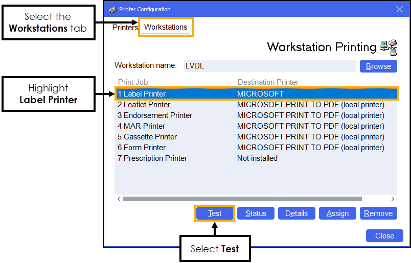 Select the Workstations tab, highlight the Label Printer and then select Test