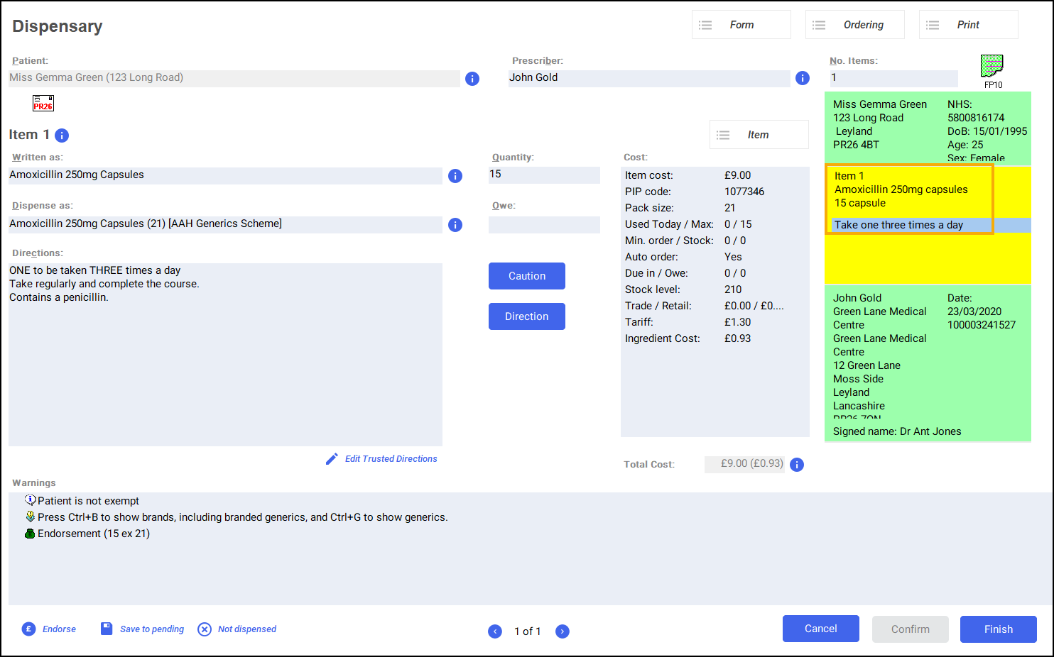 • Dispense as - Populates automatically with the dispensed item, for example, Amoxicillin 250mg Capsules 21 AAH Generics Scheme.