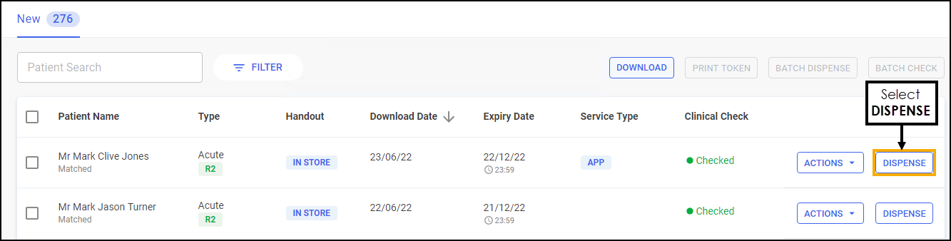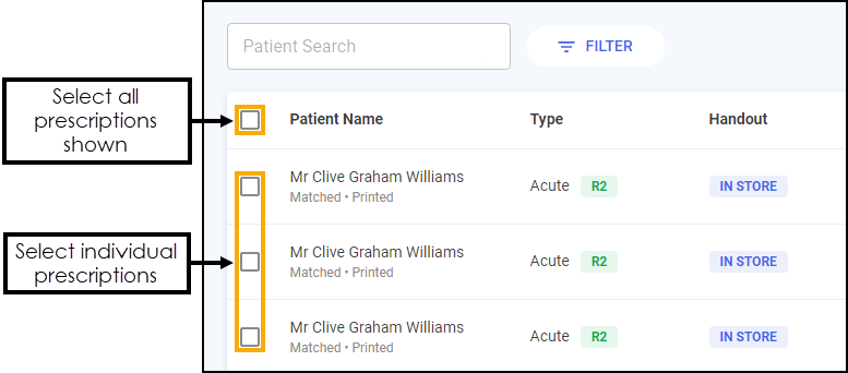 1. Select the prescriptions to dispense, either individually or chose the column to select all.