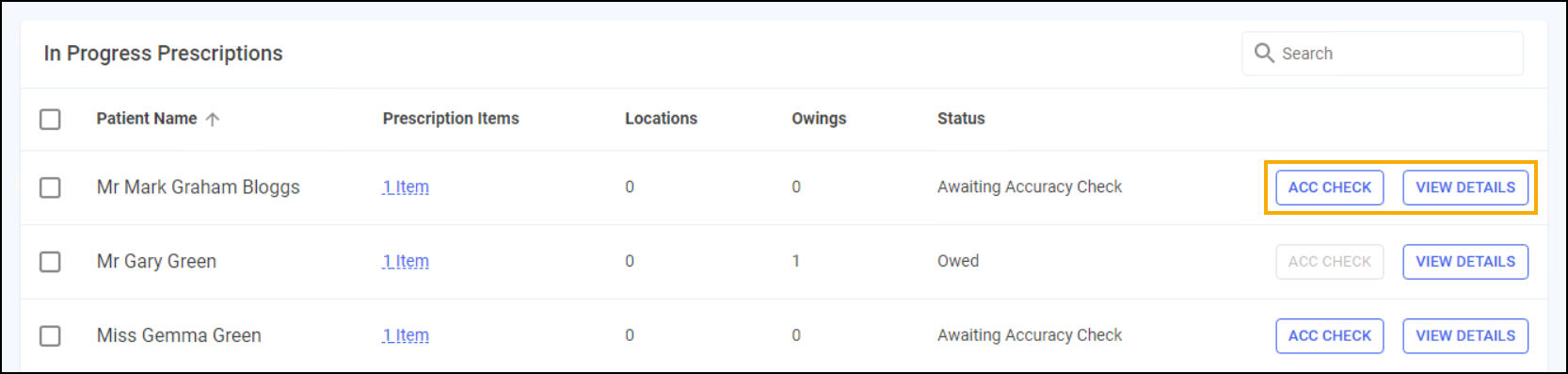 - ACC CHECK - Select to accuracy check this prescription grouping, see Accuracy Checking Prescriptions (England) for details.