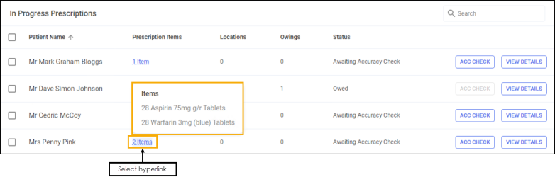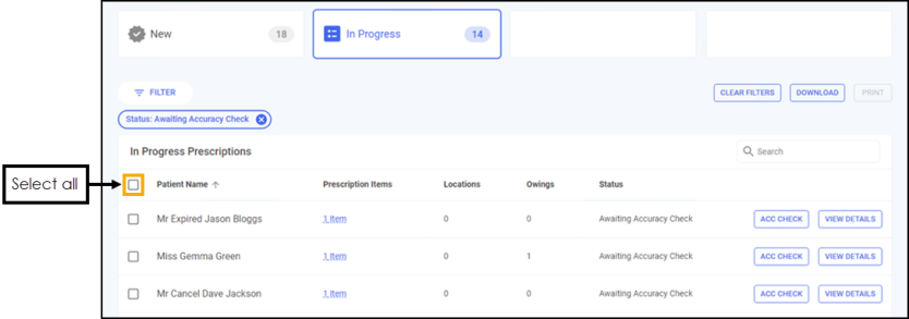 The Prescriptions - In Progress screen displays a 'basket' view of your dispensed prescriptions, where the basket contents require an accuracy check. You can easily search, sort and filter the data to manage your workload effectively.