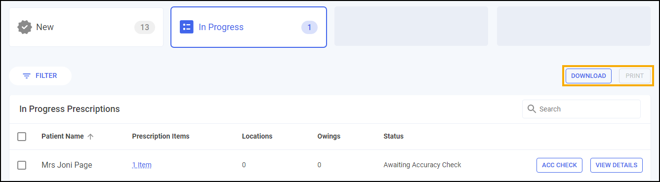 DOWNLOAD - Select to download nominated prescriptions to the Prescriptions - New screen, see Downloading Prescriptions (England) for details.