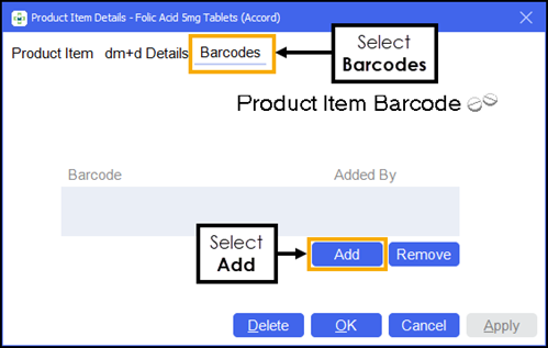 The Product Item Details screen displays for the selected product and supplier. Select the Barcodes tab and then select Add