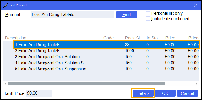 The Find Product screen displays. Select the required product and pack size and then select Details.