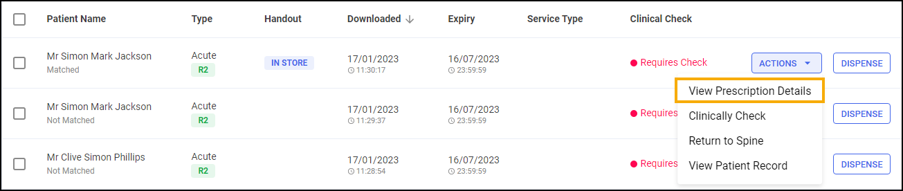 To the right of the unmatched prescription, select ACTIONS and then View Prescription Details.