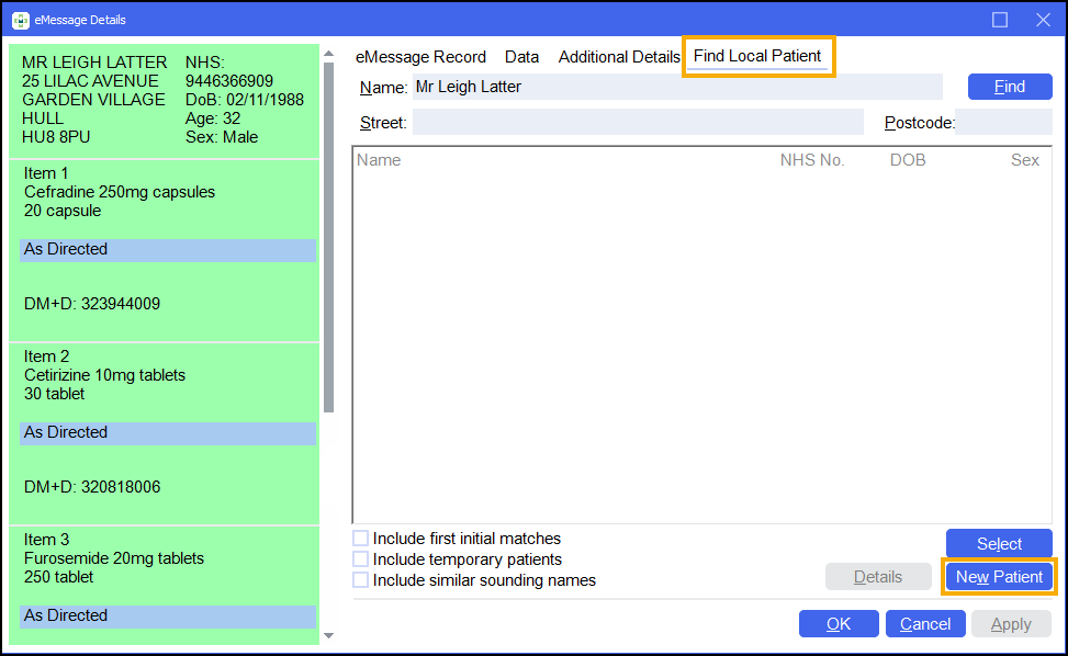 The eMessage Details screen displays, select the Find Local Patient tab.