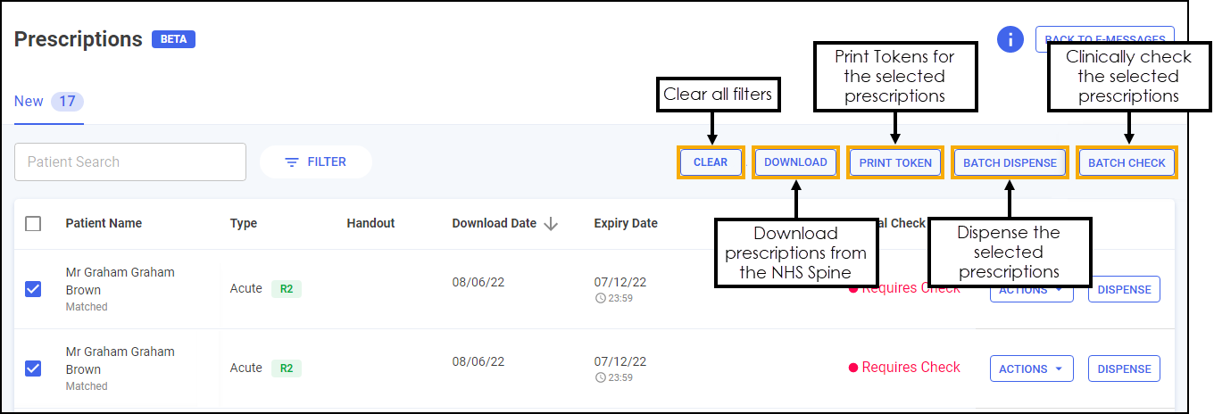 The Prescriptions - New screen displays all new EPS prescriptions that are ready to dispense and require action. You can easily search, sort and filter the prescriptions to manage your workload effectively, see Searching for, Sorting and Filtering New Prescriptions (England) for details.