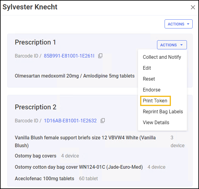 Training Tip - To print tokens for a patient with multiple prescriptions ready, go to ACTIONS above the list of prescriptions and select Print All Tokens.