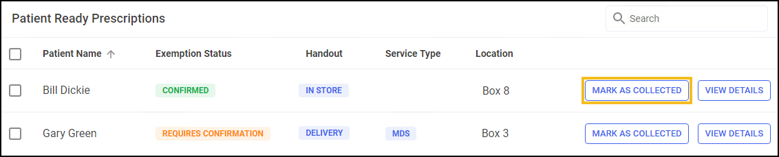 The Prescriptions - Patient Ready screen displays a view of your dispensed prescriptions that are ready for collection but are yet to be handed out. You can mark prescriptions as collected from this screen, or if using a Handout Manager device, they are automatically collected when scanning a QR code.
