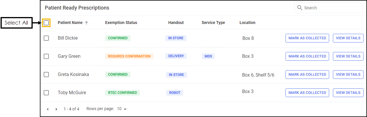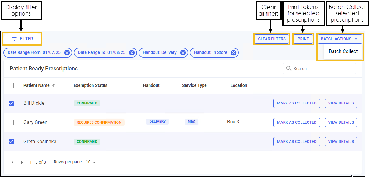 • BATCH COLLECT - Select to mark prescriptions for the selected patients as Collected.