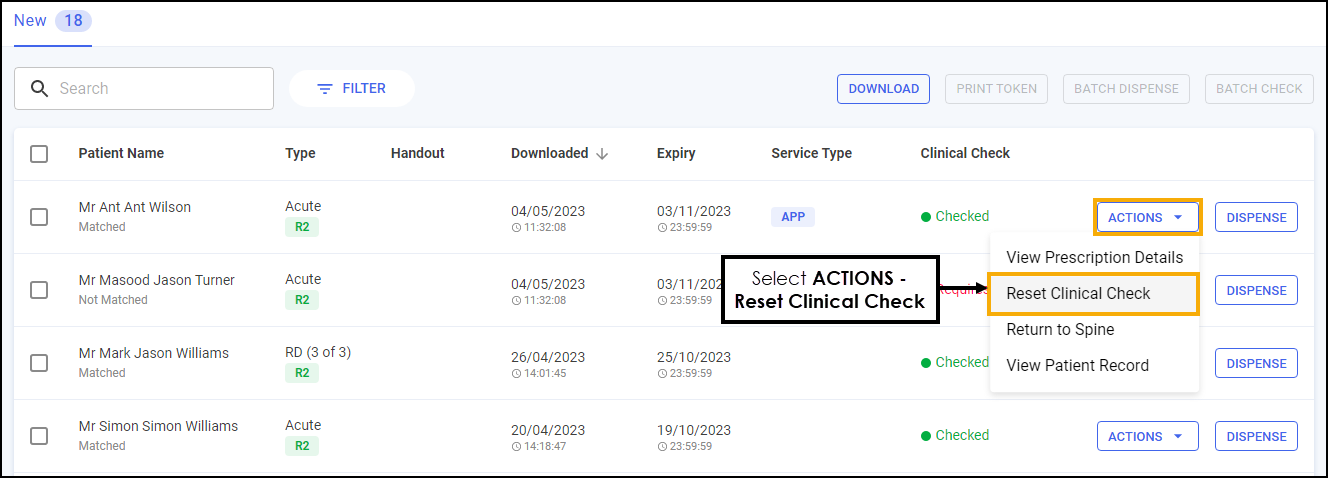 Note - Reset Clinical Check is only available for prescriptions with a status of Checked.